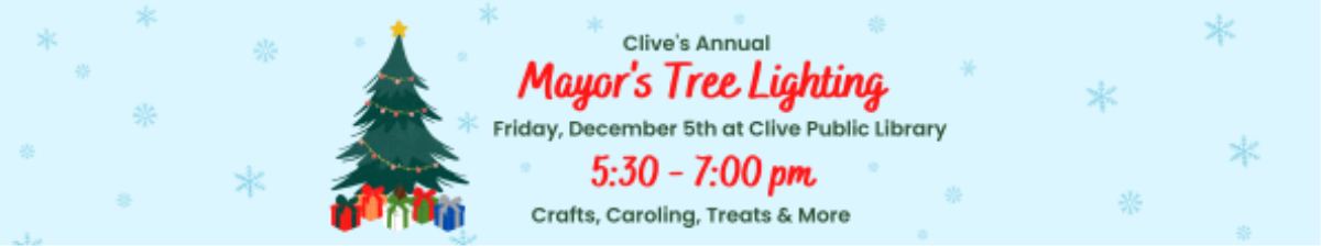 Join us for Clive's Annual Mayor's Tree Lighting! Kick off the holiday season on Friday, December 5 from 5:30-7:00 pm. The event is held at the Clive City Hall/Public Library complex (1900 NW 114th Street). Bring the family for a variety of activities, treats, and music!